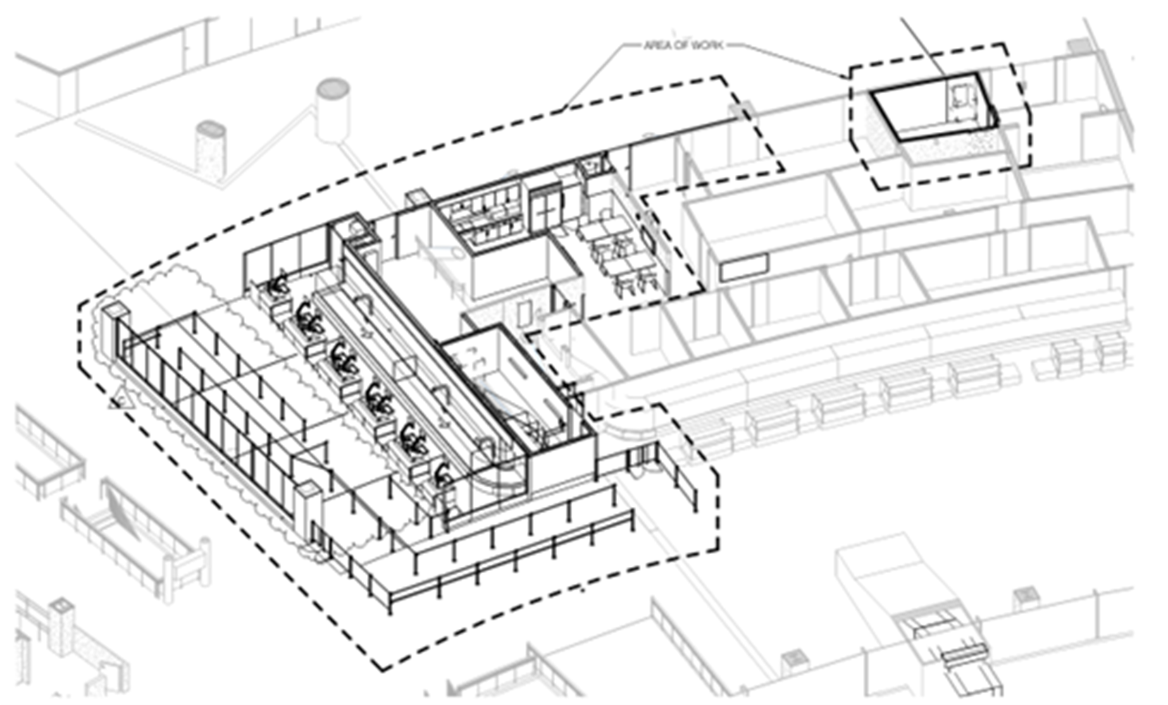 Renovations at the Ramp Level include modifying an existing pump room and reconfiguring an existing Port Room to accommodate additional pumps. The pipe route that connects the infrastructure from the pump room to the Penthouses will include a Ramp Level Utilidor and exterior pipe supports routing along the building exterior to the Concourse B Roof.